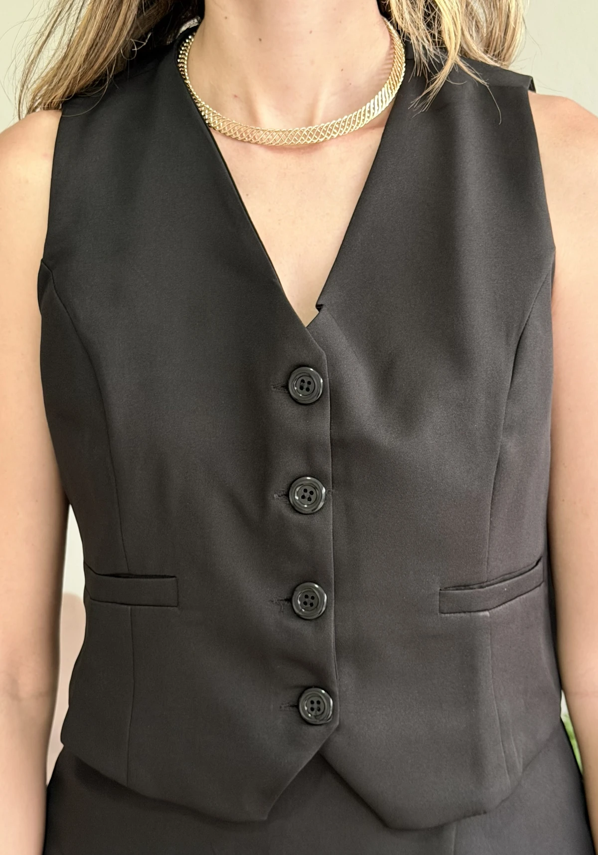 O Conjunto Isabela reúne estilo, modernidade e sofisticação em duas peças que se complementam perfeitamente. O colete, com corte impecável e acabamento refinado, adiciona estrutura e elegância ao visual, criando um efeito alongado e super atual.
