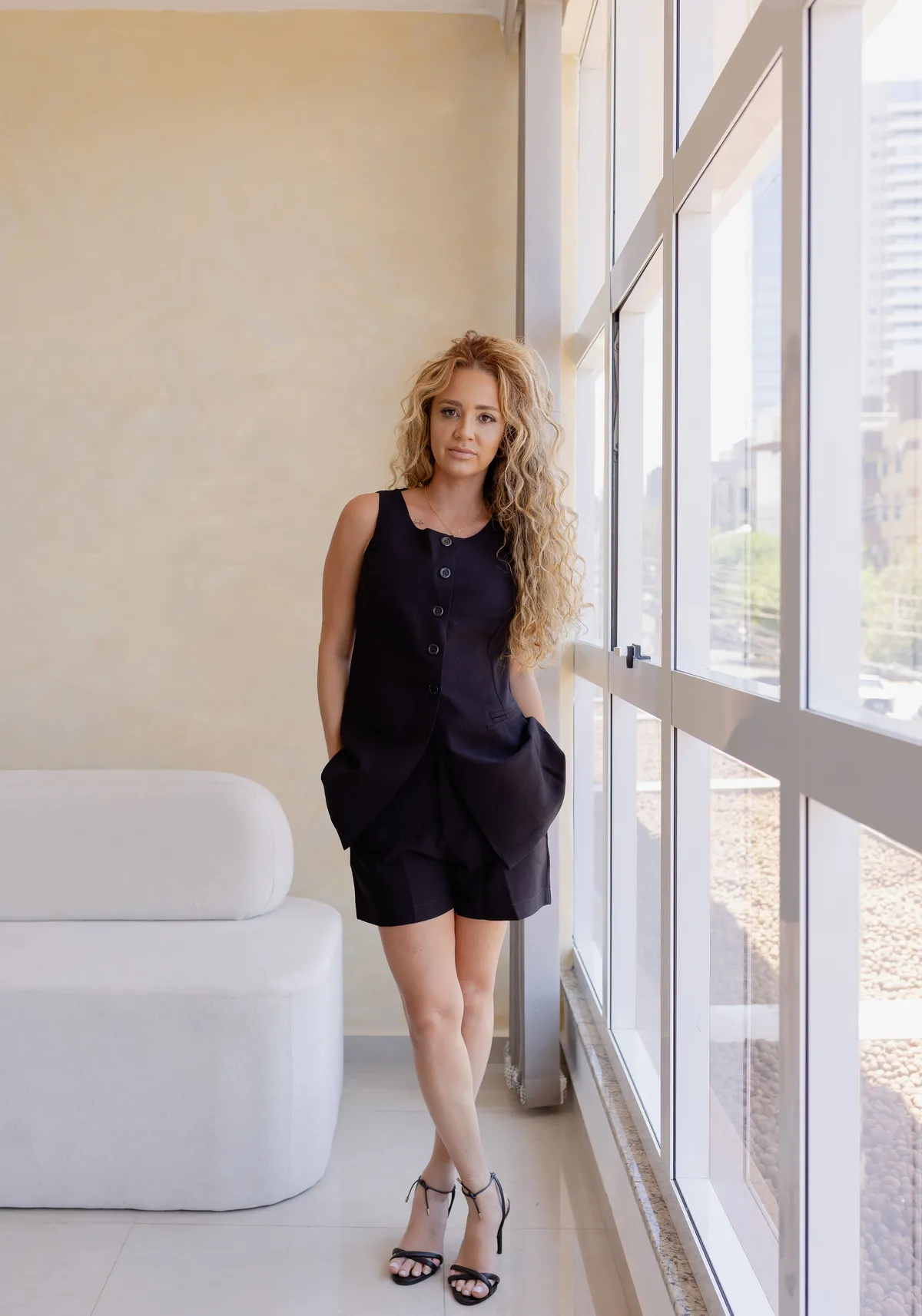 Short com bolsos + colete alongado com botões e abertura frontal — aquele look moderno que valoriza qualquer produção.